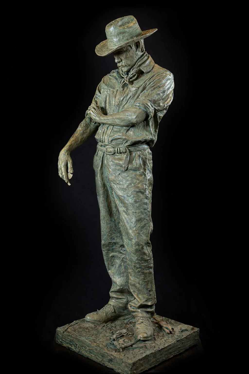 The Steward is a life-size bronze honoring the Mexican-American laborers whose hands have shaped the agricultural landscape of the American West. Installed at JDM Organic Farms in California, the sculpture depicts a field worker in a moment of preparation: his head bowed as he rolls his sleeve, pruning shears in his right hand, gloves hanging from his back pocket. His clothing is oversized, allowing the lean strength of the body beneath to emerge—an anatomy formed through repetition, endurance, and years in the fields. The posture is humble but resolute, suggesting a man deeply at ease within the rigor and rhythms of work and land.