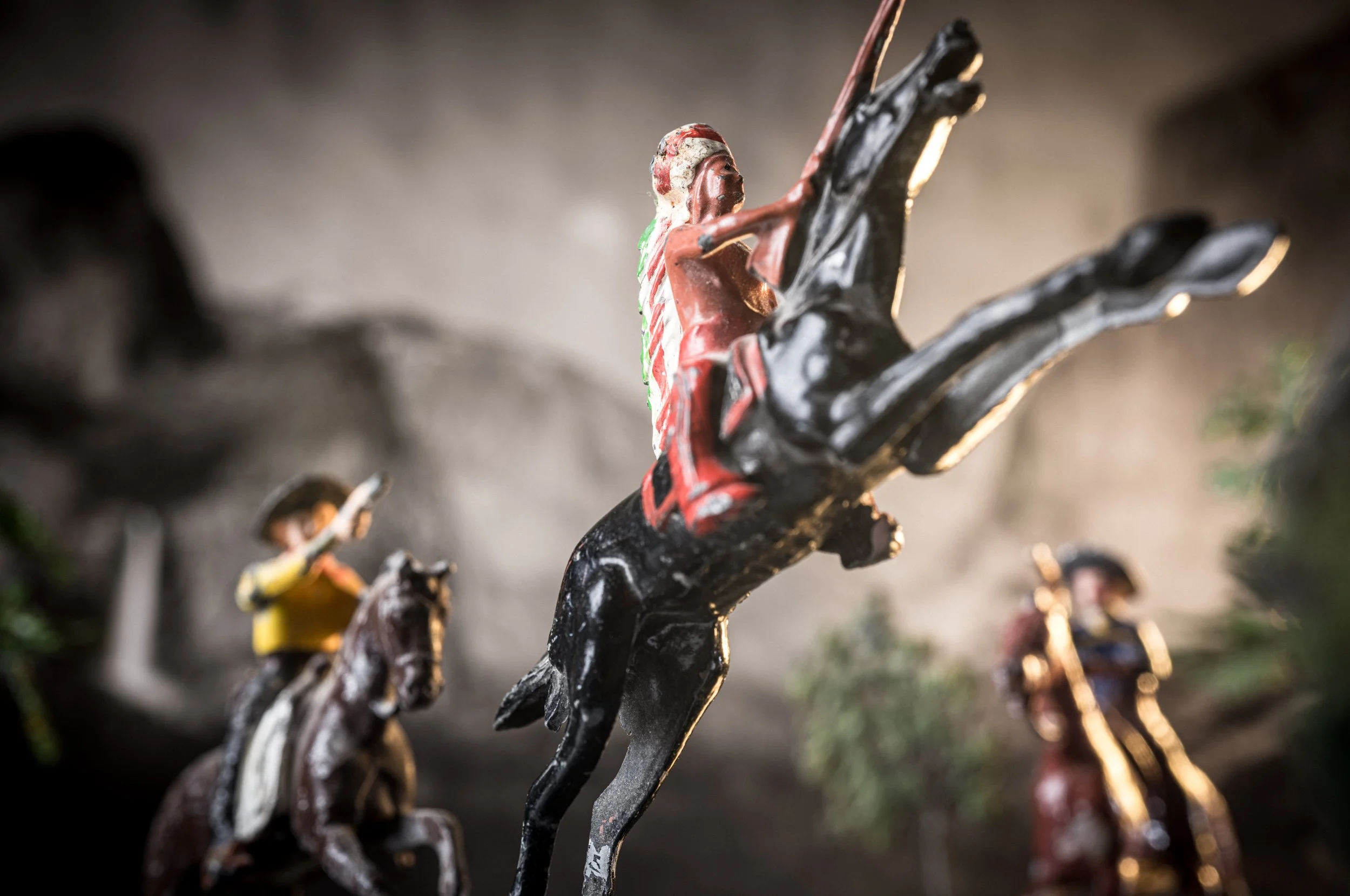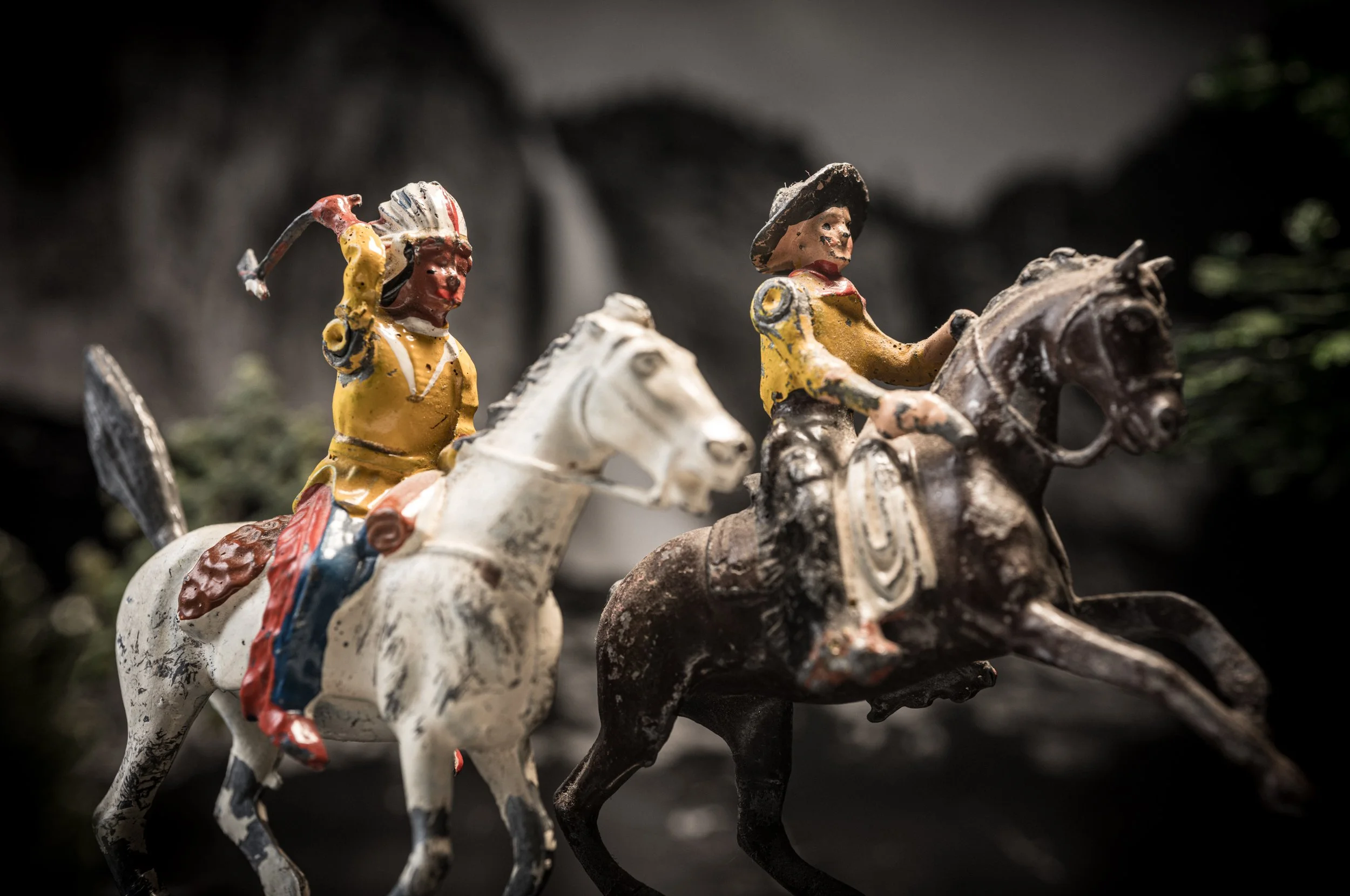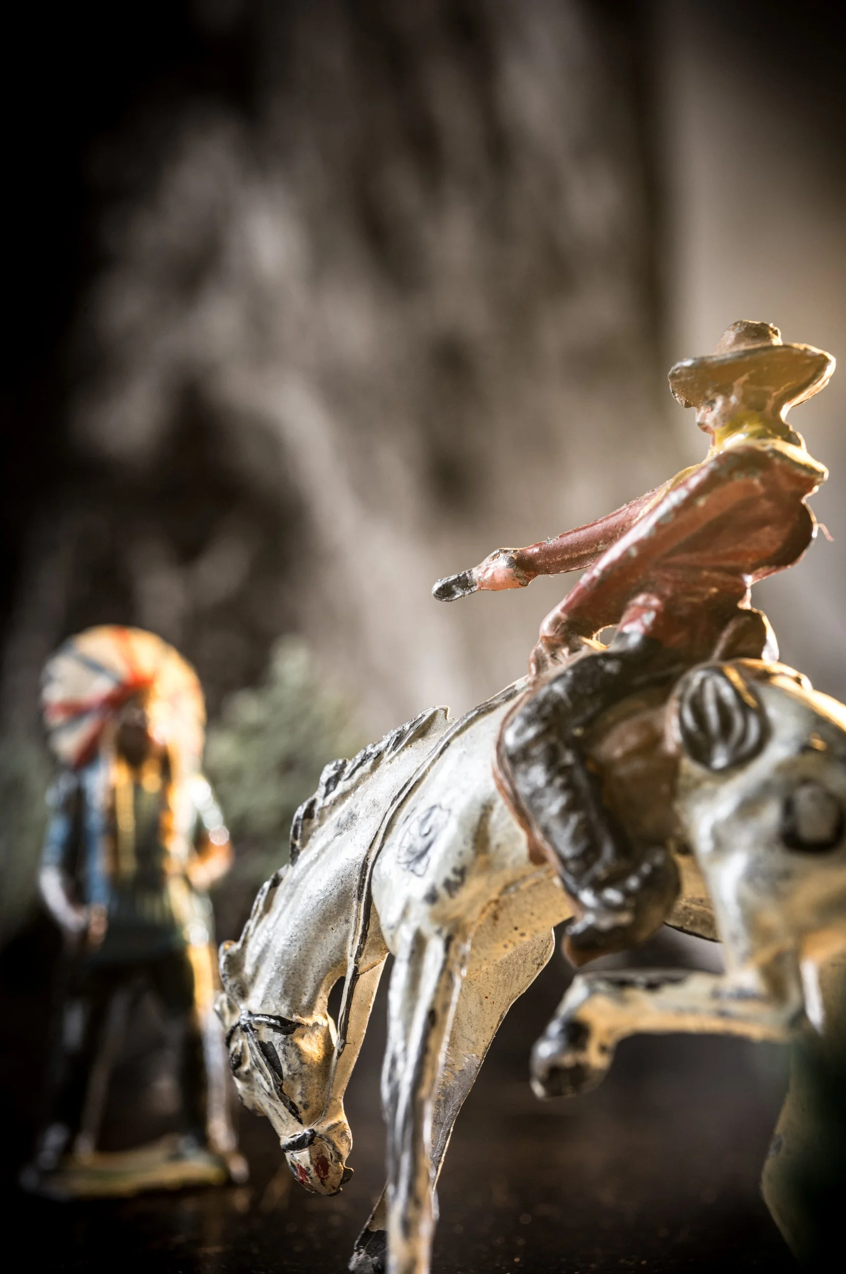 Led West examines how the mythology of the American West has been constructed through images, stories, and popular culture. Using small metal cowboy and Indigenous figurines originally loaned by my brother, painter Bradford Overton, the photographs stage scenes within miniature landscapes built from large prints of my Wild America photographs. By combining these childhood objects with monumental Western landscapes, the work explores how narratives of frontier conflict and heroism are shaped and reimagined through visual culture. Suspended between play, history, and invention, the images reveal how the myth of the West continues to be authored long after the events it claims to depict.