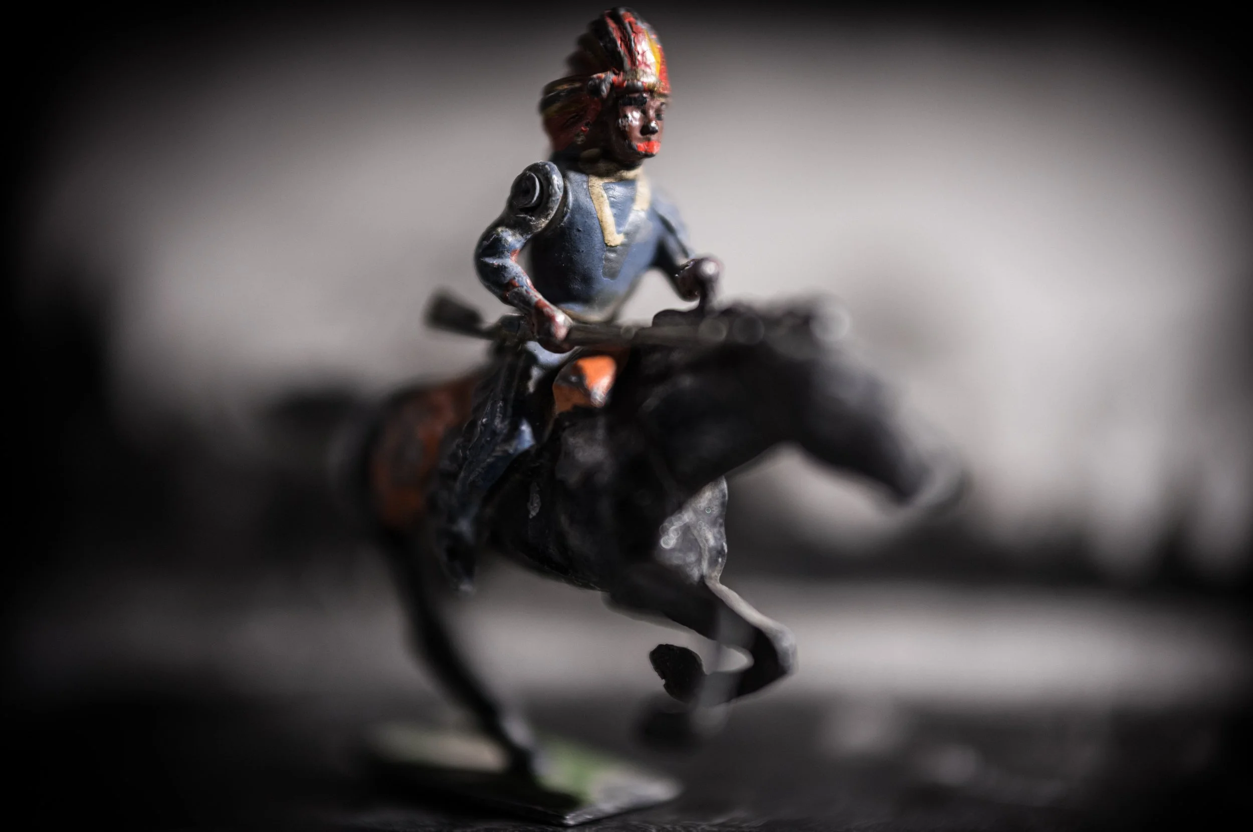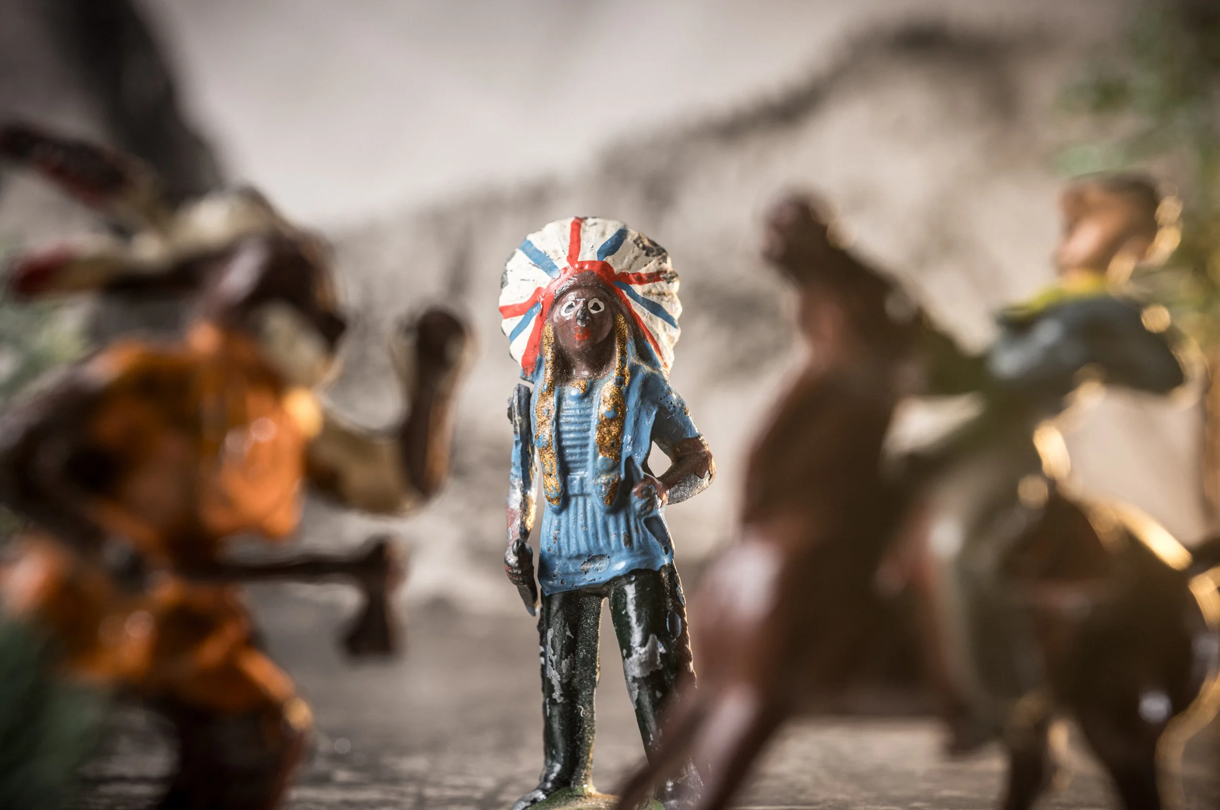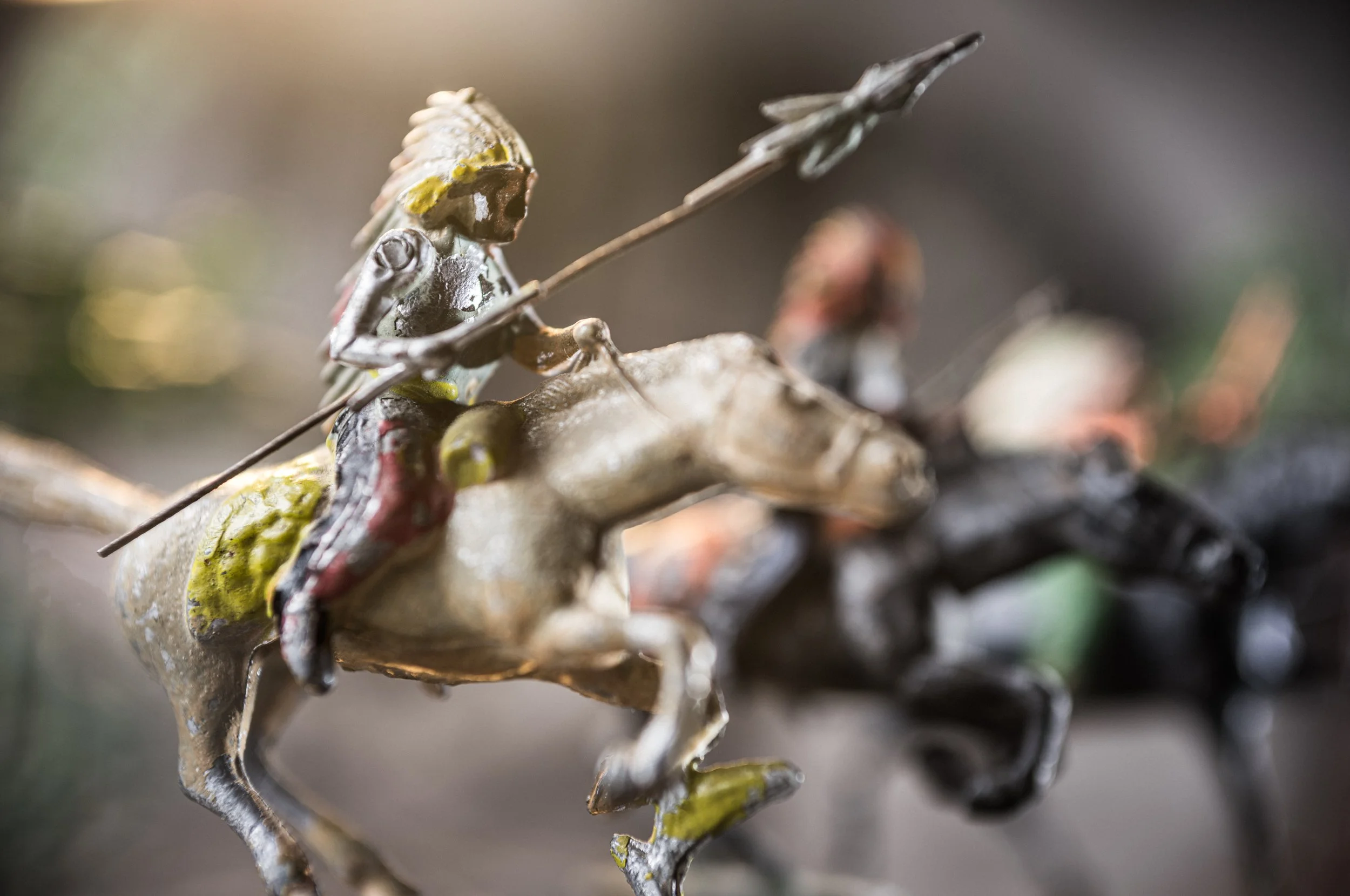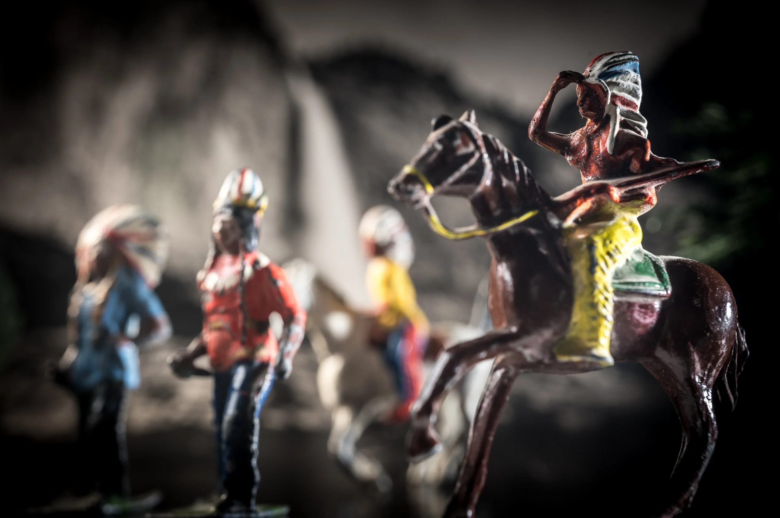 Led West examines how the mythology of the American West has been constructed through images, stories, and popular culture. Using small metal cowboy and Indigenous figurines originally loaned by my brother, painter Bradford Overton, the photographs stage scenes within miniature landscapes built from large prints of my Wild America photographs. By combining these childhood objects with monumental Western landscapes, the work explores how narratives of frontier conflict and heroism are shaped and reimagined through visual culture. Suspended between play, history, and invention, the images reveal how the myth of the West continues to be authored long after the events it claims to depict.